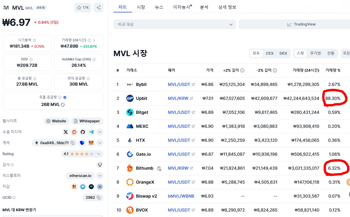 예를 들어, 엠블(MVL)의 경우 전체 거래량 중 업비트에서 약 85.7%, 빗썸에서 약 9.63%가 이루어져, 국내 거래소에서 총 95% 이상의 거래가 진행되고 있습니다.